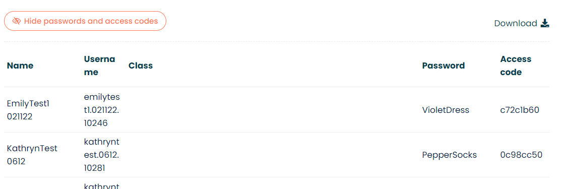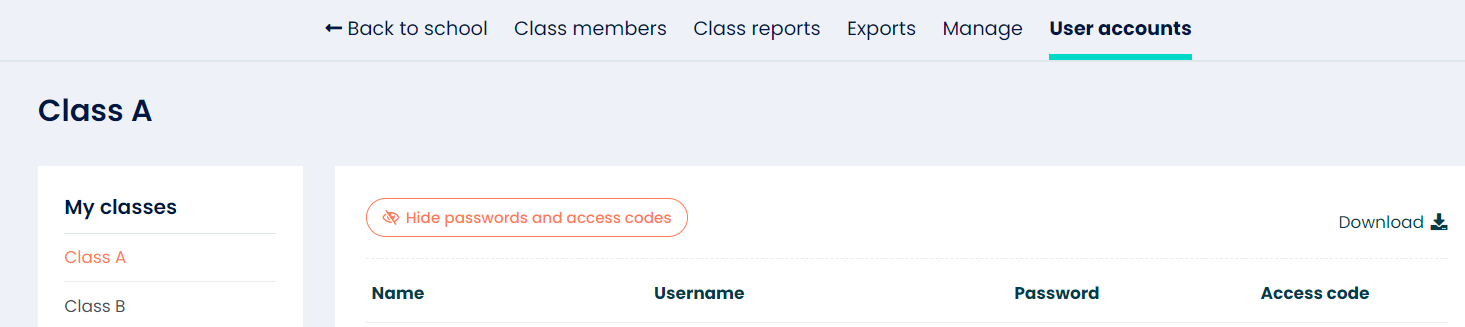 - If you want to view your learners' login credentials for a specific class, you can select the class and open the "user accounts" tab.