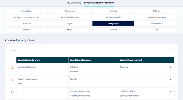 If your school's Bedrock subscription includes Mapper, every learner will be able to view every subject has their Knowledge Organiser allowing them to focus on subject-specific understanding when revisiting vocabulary.
