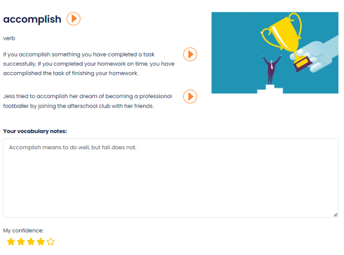 By looking at the ‘Vocabulary I am learning’ column, a teacher can see which words a learner is still actively learning. They can add to Bedrock’s multimodal teaching by giving in-class examples of this vocabulary to aid deep comprehension.For differentiated activities in the classroom