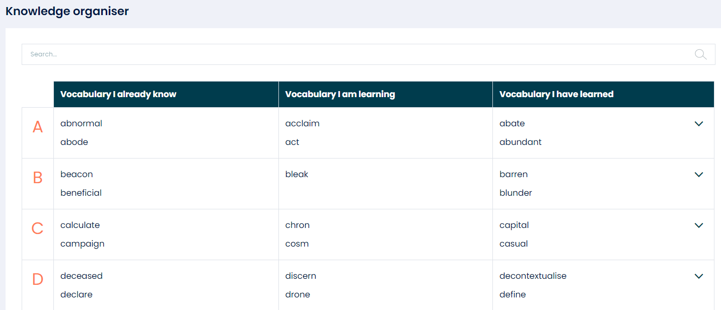 The teacher can set a writing task and ask all learners to use words from their knowledge organiser (ideally, words in the ‘I am learning’ and ‘I have learned’ columns). This encourages consistency, yet differentiation. It also encourages metacognition as learners will think about their Bedrock words outside of Bedrock and how they put this learning into practice.For whole class activities