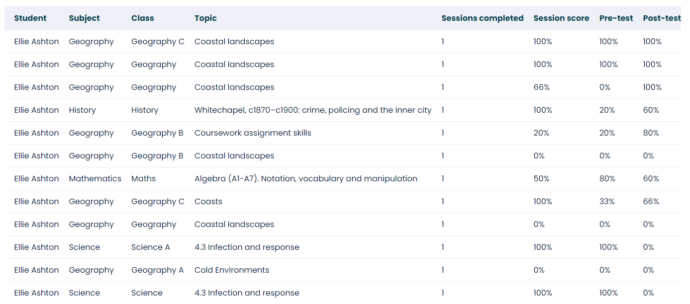 *Note: The "average session score" is calculated based on the average score of sessions in the time parameters a teacher sets. For example, by selecting to view a whole term, teachers will see a learner's average score over that period.