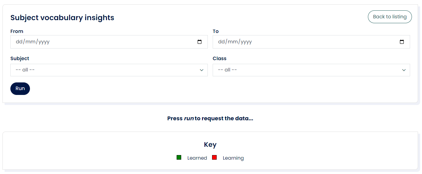- Select the 'Subject vocabulary insights' icon and enter the filter options.