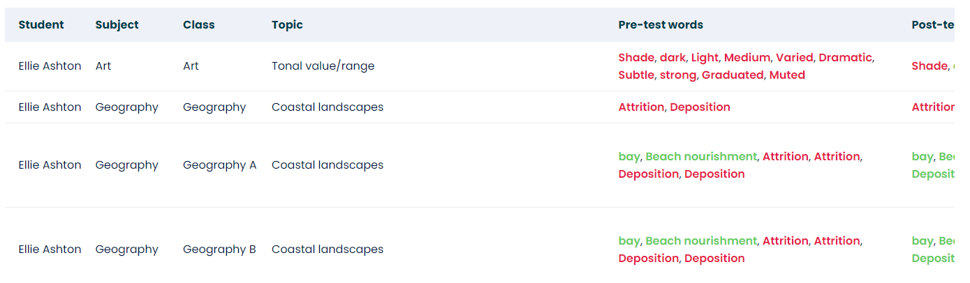 The report is colour coded in green and red showing the words learners got correct and incorrect, providing insight into vocabulary they may need extra support with.