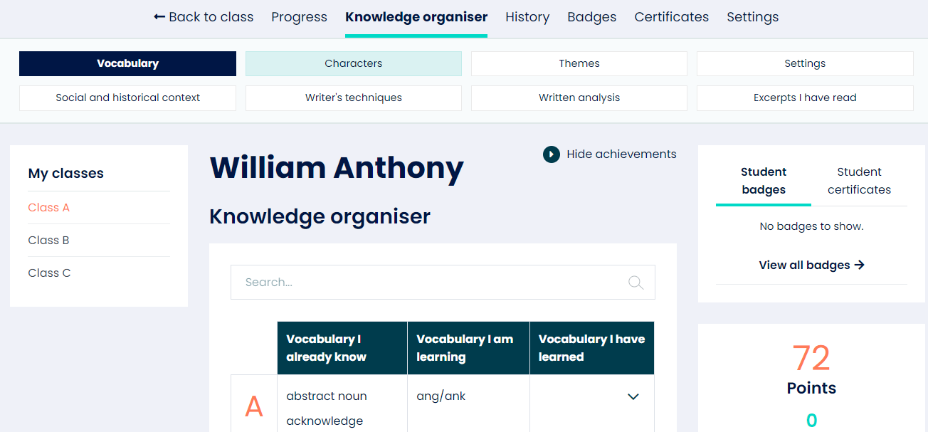You can view a learner’s knowledge organiser at the learner level in the teacher dashboard.