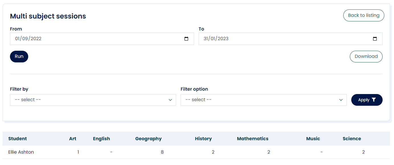 The "multi-subject sessions" report shows the number of sessions completed in every subject across the curriculum in a chosen period.